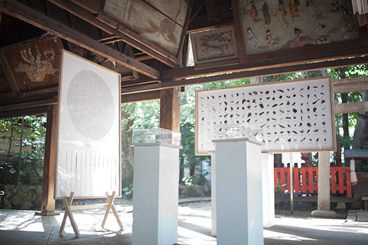 cracked mirror, fallen leaf found in Kitano Tenmangu Shrine that were being cut into the shape of the crakced mirror