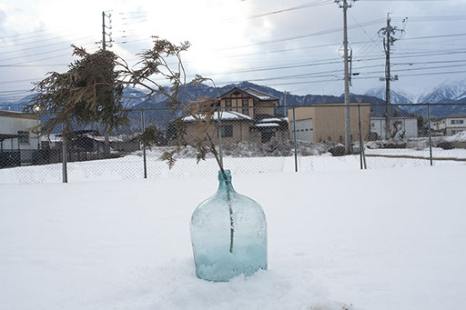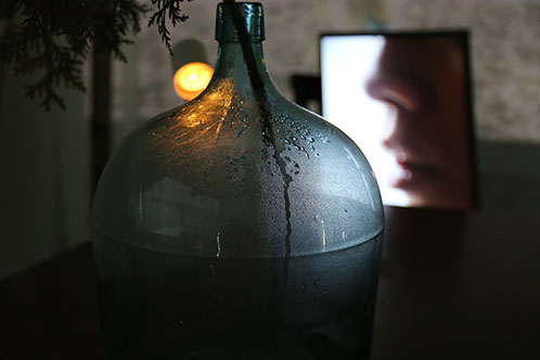 Branch, glass bottle , desk lamp, TV monitor, melted snow in the bottle