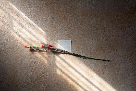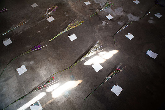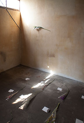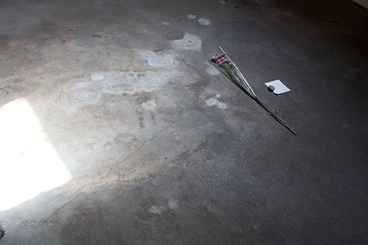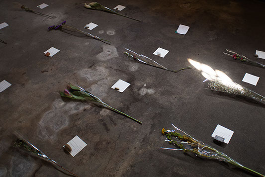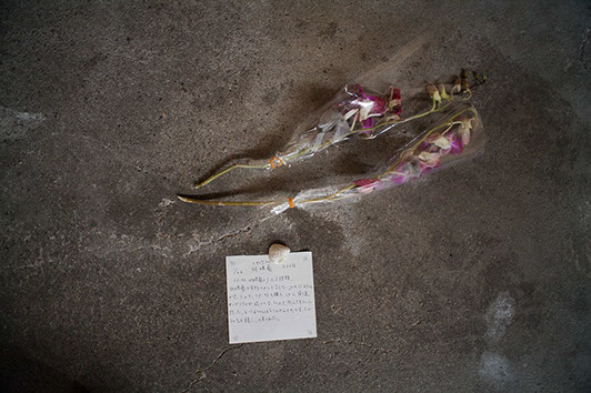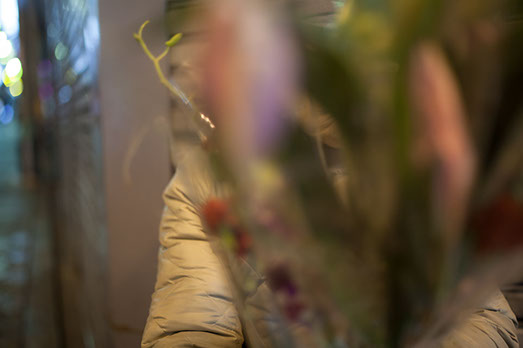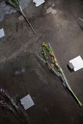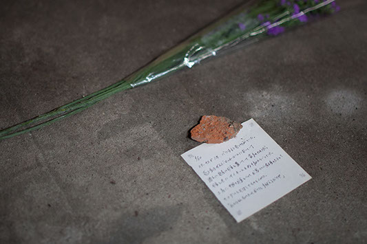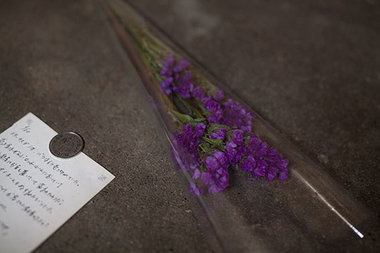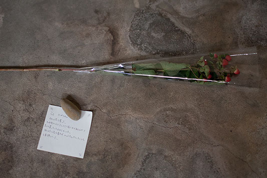 I went to Tobita shinchi to buy a flower every day. I put them in a room of a former, emptied candy factory, where was about 20-minute walk away from the flower vender.Also I placed the paper thas had the anecdotes written on it about each encounter I had with the flower vender. Meanwhile I picked a rock everyday during the 20-minute walk in between the flower vender and the candy factory as a paper weight.