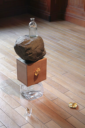 acrylic photo, Gold leaf,Glass vase, petals,stone, wood box, print of ukiyoe, wrapping of tin for candy