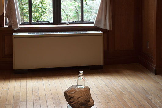 Glass vase, petals, stone, print of Ukiyoe
