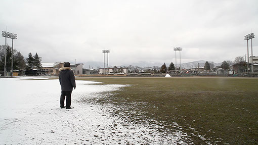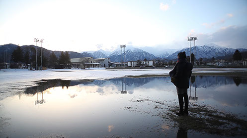 Birdwatching woman standing on the public ground in Shinano-omachi