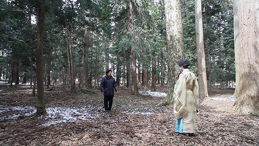 Opera singer & priest of Shinto Shrine performing in the forest of Nyakuichiouji Shirine