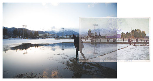 "Overlooking the Japan's Alps mountains from shinano omachi" is wrriten on the postcard.